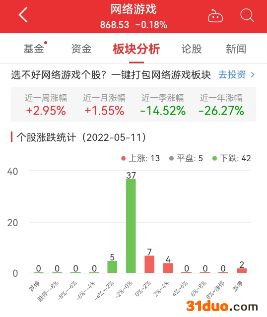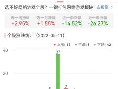 中国经济网北京5月11日讯 今日,网络游戏板块整体跌幅0.18%,其中,13只股票上涨,5只股票平盘,42只股票下跌。
