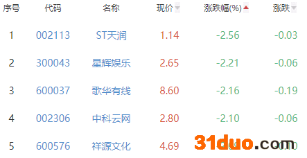 ST天润、星辉娱乐、歌华有线、中科云网、祥源文化位列涨幅榜后五位,涨幅分别为-2.56%、-2.21%、-2.16%、-2.10%、-2.09%。