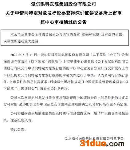 中国经济网北京5月12日讯 爱尔眼科(300015.SZ)昨日晚间发布公告,公司申请向特定对象发行股票获得深交所上市审核中心审核通过。