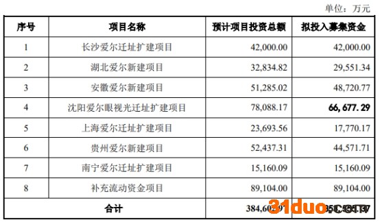 1.长沙爱尔迁址扩建项目,拟投入募集资金42,000.00万元;2.湖北爱尔新建项目,拟投入募集资金29,551.34万元;3.安徽爱尔新建项目,拟投入募集资金48,720.77万元;4.沈阳爱尔眼视光迁址扩建项目,拟投入募集资金66,677.29万元;5.上海爱尔迁址扩建项目,拟投入募集资金17,770.17万元;6.贵州爱尔新建项目,拟投入募集资金44,571.71万元;7.南宁爱尔迁址扩建项目,拟投入募集资金15,160.09万元;8.补充流动资金项目,拟投入募集资金89,104.00万元。