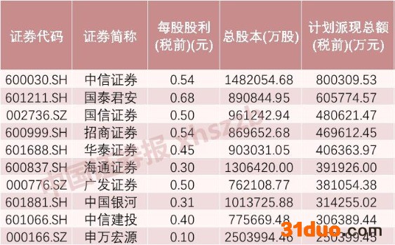 数据显示,当前共有30多家上市券商公布其年度派现计划,派现总额(税前)已超过575亿元。其中,中信证券、国泰君安2家券商派现总额均超过60亿元。以5月10日收盘价计算,有19家券商股息率超过1.9%,跑赢余额宝最新七日年化收益, 长江证券、国信证券股息率则更是超过了5%。