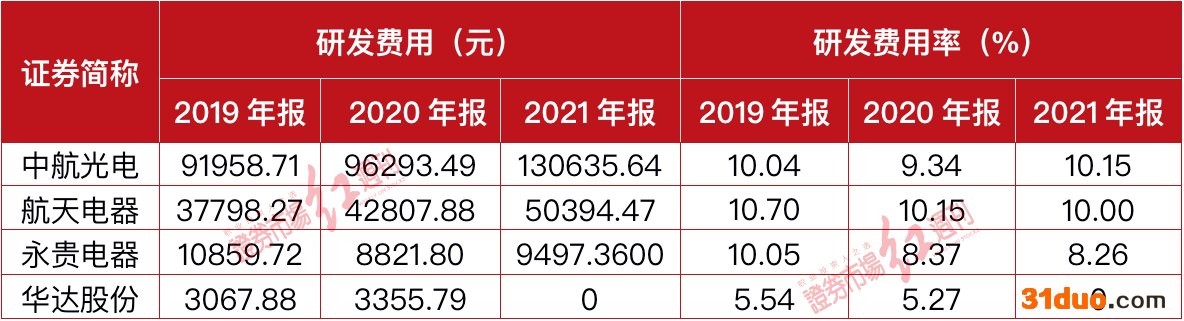 《红周刊》对比三家公司发现,华达股份的研发费用及占比均不及上述三家公司。报告期内,公司研发费用分别为2414.61万元、3067.88万元、3355.79万元、1873.56万元,占营业收入的比例分别为4.80%、5.54%、5.27%、4.62%,而可比三家公司的研发费用率则均在6%~10%之间。
