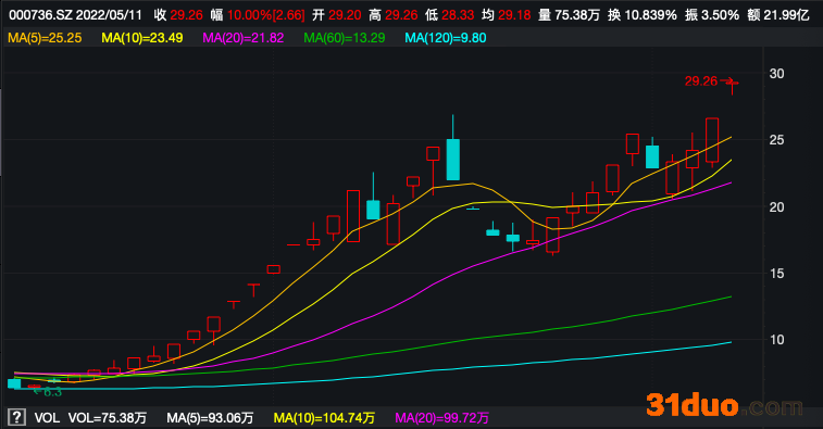 中新经纬5月11日电 11日,中交地产股份有限公司(下称中交地产)再度迎来涨停,股价逼近30元/股,当日成交额达21.99亿元,总市值突破200亿元关口。根据中新经纬统计,自3月16日以来的36个交易日中,中交地产共计出现了17次涨停,股价上涨356.47%。