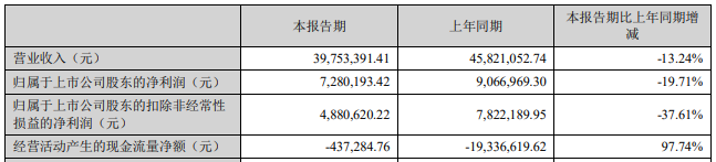 2022年第一季度,中英科技实现营业收入3975.34万元,同比下降13.24%;归属于上市公司股东的净利润为728.02万元,同比下降19.71%;归属于上市公司股东的扣除非经常性损益的净利润为488.06万元,同比下降37.61%;经营活动产生的现金流量净额为-43.73万元,同比增长97.74%。