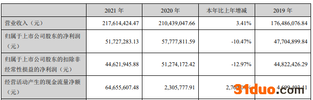 2021年,中英科技实现营业收入2.18亿元,同比增长3.41%;归属于上市公司股东的净利润为5172.73万元,同比下降10.47%;归属于上市公司股东的扣除非经常性损益的净利润为4462.19万元,同比下降12.97%;经营活动产生的现金流量净额为6465.56万元,同比增长2704.07%。