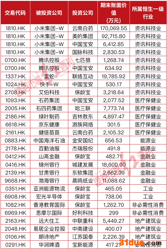 如小米集团-W,被云南白药、美的集团、中国宝安、国脉科技等共同持仓,其中云南白药持仓小米集团-W金额最高,去年期末账面价值达17亿元,美的集团持股市值为9.2亿元,中国宝安、国脉科技分别持仓6412万元、2830万元;腾讯控股获得七匹狼、中国宝安等共同持有,两者分别持仓1268万元与634万元。
