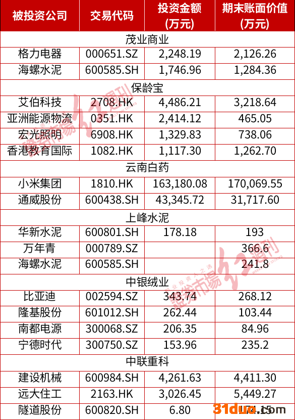 茂业商业主业为百货零售,属于传统行业,据其财报数据显示,其通过二级市场购入且持有格力电器、海螺水泥等。另外,其此前还通过二级市场购入中信证券、万科A、贵州茅台、华域汽车等白马龙头股,观察来看,茂业商业跨界布局的行业包括金融、水泥、地产、汽车等多个领域。此外,主营为食品制造的保龄宝跨行布局了软件、能源、教育等其他多个行业,如港股上市公司艾伯科技、亚洲能源物流、宏光照明、香港教育国际等。云南白药布局小米集团(港股)、通威股份等科技与光伏领域。