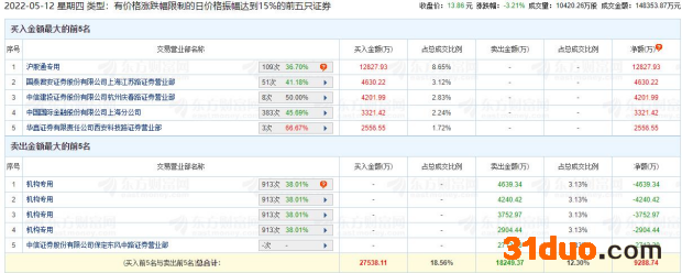 中国经济网北京5月12日讯昆药集团(600422.SH)今日股价下跌,截至收盘报13.86元,跌幅3.21%。龙虎榜数据显示,卖出昆药集团金额最