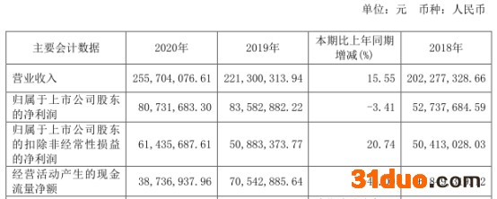 2020年,公司营业收入2.56亿元,同比增长15.55%;归属于上市公司股东的净利润8073.17万元,同比减少3.41%;归属于上市公司股东的扣除非经常性损益的净利润6143.57万元,同比增长20.74%;经营活动产生的现金流量净额3873.69万元,同比减少45.09%。