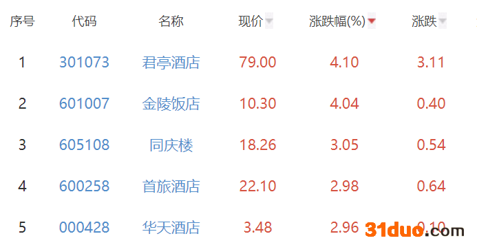 其中,君亭酒店、金陵饭店、同庆楼、首旅酒店、华天酒店位列板块涨幅前五位,涨幅分别为4.10%、4.04%、3.05%、2.98%、2.96%。
