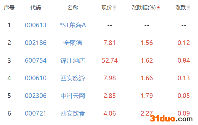 全聚德、锦江酒店、西安旅游、中科云网、西安饮食位列涨幅榜后五位,涨幅分别为1.56%、1.62%、1.66%、1.79%、2.27%。