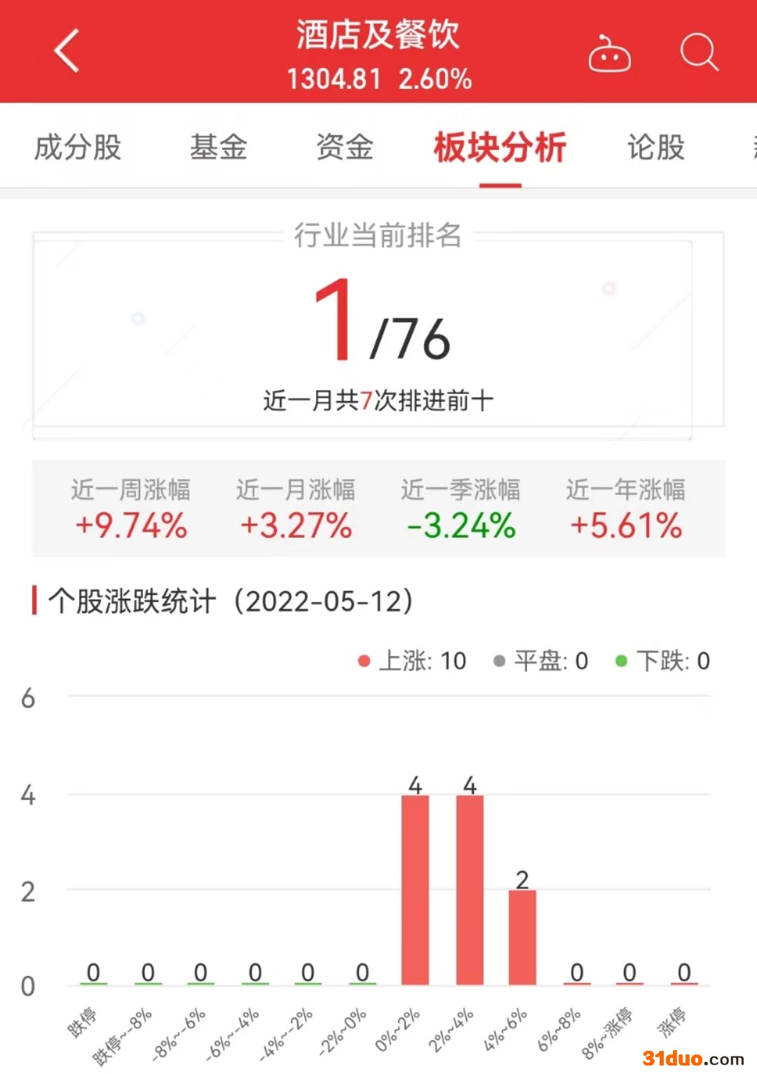 中国经济网北京5月12日讯 今日,酒店及餐饮板块整体涨幅2.60%,10只股票均上涨。
