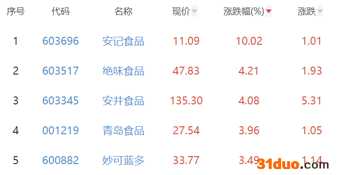 其中,安记食品、绝味食品、安井食品、青岛食品、妙可蓝多位列板块涨幅前五位,涨幅分别为10.02%、4.21%、4.08%、3.96%、3.49%。
