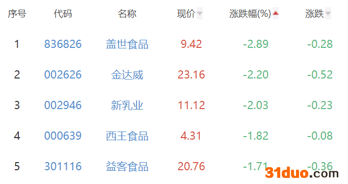 盖世食品、金达威、新乳业、西王食品、益客食品位列涨幅榜后五位,涨幅分别为-2.89%、-2.20%、-2.03%、-1.82%、-1.71%。