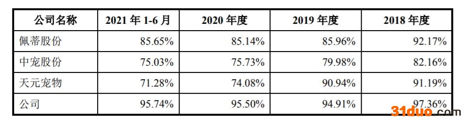 相比而言,源飞宠物仍较为依赖外销。数据显示,2018年、2019年、2020年及2021年上半年,源飞宠物外销收入占主营业务收入的比例分别为97.36%、94.91%、95.50%、95.74%;内销收入分别为1141.45万元、2611.73万元、2730.43万元、2031.08万元,占比分别为2.64%、5.09%、4.50%、4.26%。