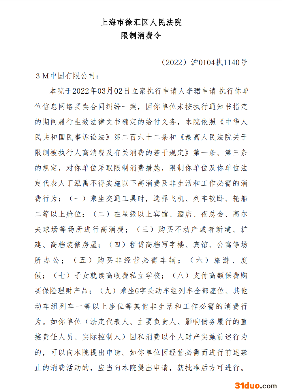 据了解,2022年3月2日,上海市徐汇区人民法院立案执行申请人申请执行3M公司信息网络买卖合同纠纷一案,3M公司未按执行通知书制定的期间履行生效法律文书确定的给付义务。