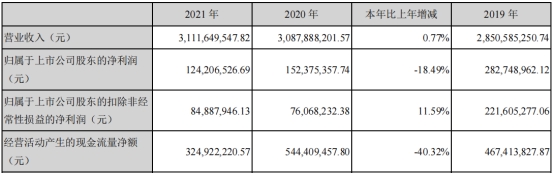 贵州百灵年报显示,2021年,公司实现营业收入31.12亿元,同比增长0.77%;归属于上市公司股东的净利润1.24亿元,同比下降18.49%;归属于上市公司股东的扣除非经常性损益的净利润8488.79万元,同比增长11.59%;经营活动产生的现金流量净额为3.25亿元,同比下降40.32%。