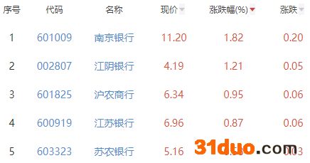 其中,南京银行、江阴银行、沪农商行、江苏银行、苏农银行位列板块涨幅前五位,涨幅分别为1.82%、1.21%、0.95%、0.87%、0.58%。