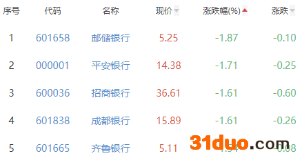 邮储银行、平安银行、招商银行、成都银行、齐鲁银行位列涨幅榜后五位,涨幅分别为-1.87%、-1.71%、-1.61%、-1.61%、-1.54%。