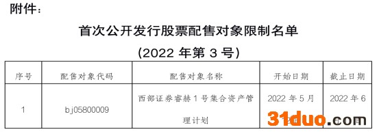 中国经济网北京5月12日讯 昨日,中国证券业协会发布消息,将西部证券睿赫1号集合资产管理计划列入首次公开发行股票配售对象限制名单,开始日期为2022年5月12日,截止日期为2022年6月11日。