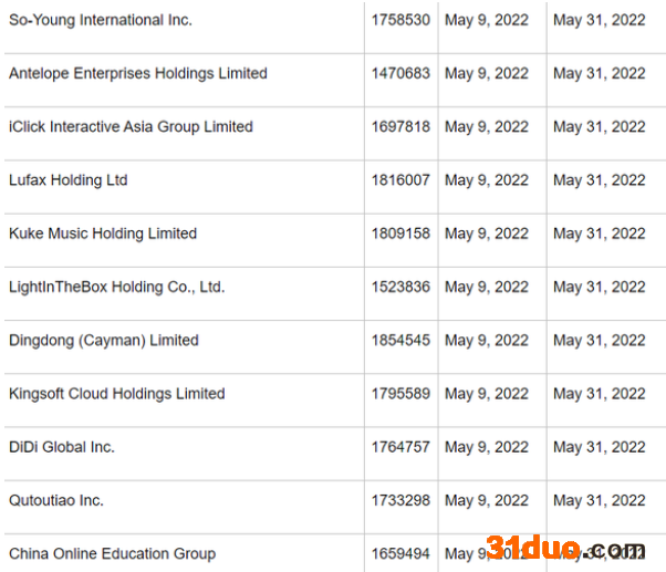 SEC官网公布的名单显示,此次,被列入“预摘牌名单”的包括新氧、Antelope Enterprise、爱点击、陆金所控股、库客音乐、兰亭集势、叮咚买菜、金山云、滴滴、趣头条和51Talk。