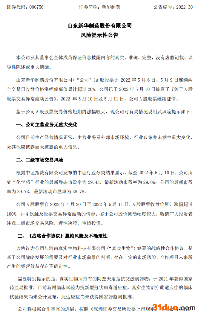 对于近期的国产新冠口服药传闻,新华制药解释称,此前该公司与河南真实生物科技有限公司签署的战略性合作协议,是基于公司战略发展的需要及对行业市场前景的判断,存在一定的市场风险,合作项目未来所产生的经营效益存在不确定性。
