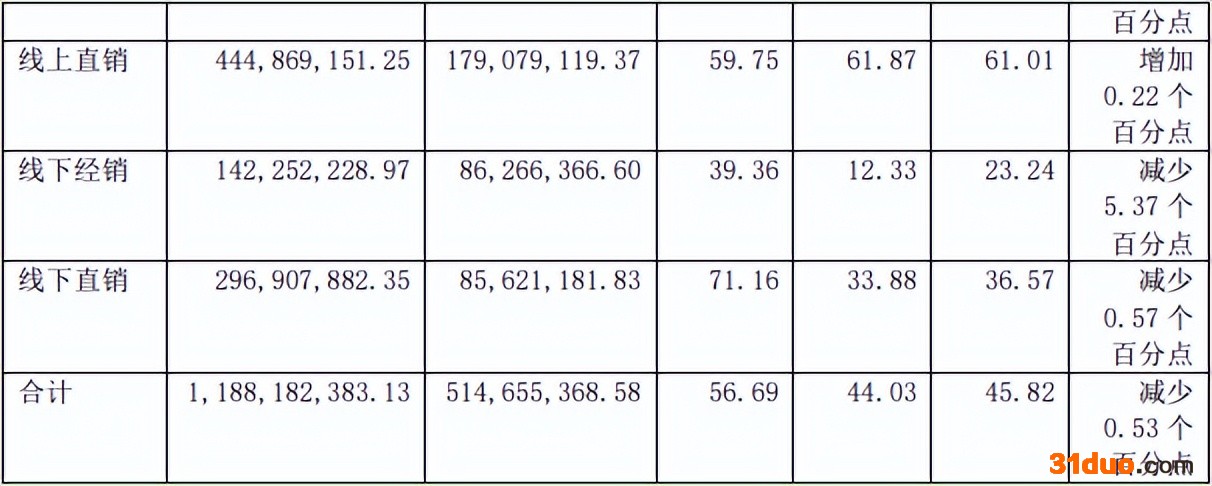 与此同时,虽然线上直销的毛利率同比微增0.22个百分点,但是线下直销和线下经销毛利率分别下滑0.57个百分点和5.37个百分点,导致公司主营业务毛利率减少0.53个百分点。