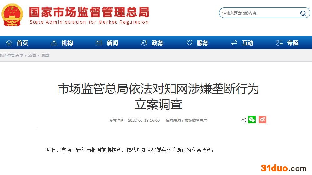 中新经纬5月13日电 据市场监管总局网站消息,近日,市场监管总局根据前期核查,依法对知网涉嫌实施垄断行为立案调查。