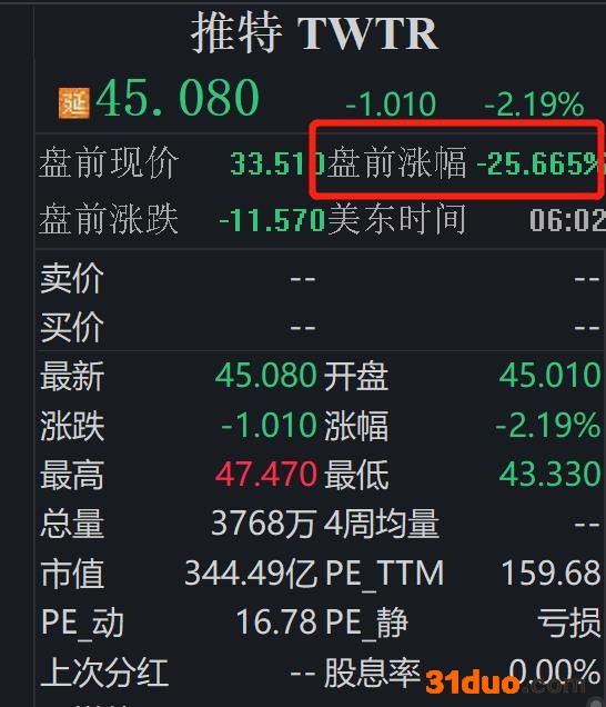 中新经纬5月13日电 马斯克称收购暂时搁置。截至发稿,推特美股盘前跌幅扩大至超25%。