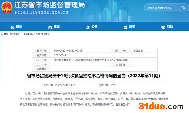 中国经济网北京5月13日讯 近日,江苏省市场监督管理局网站公布了《省市场监管局关于16批次食品抽检不合格情况的通告(2022年第11期)》。近期,江苏省市场监督管理局完成食品安全监督抽检任务429批次,涉及粮食加工品、食用农产品、糕点、炒货食品及坚果制品、水产制品、茶叶及相关制品、水果制品、乳制品、豆制品、餐饮食品、罐头、速冻食品、饼干、蜂产品及食品添加剂等食品。根据食品安全国家标准检验和判定,其中抽样检验项目合格样品413批次、不合格样品16批次。