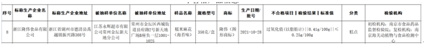 此外,江苏永辉超市有限公司常州金坛新天地分公司销售的标称浙江隆伟食品有限公司生产的糯米麻花(海苔味)(规格型号:350克/盒;生产日期/批号:2021-10-28),过氧化值(以脂肪计)项目不合格,检验结果为0.41g/100g,而标准值为≤0.25g/100g。初检机构为南京市食品药品监督检验院,复检机构为南京海关动植物与食品检测中心。