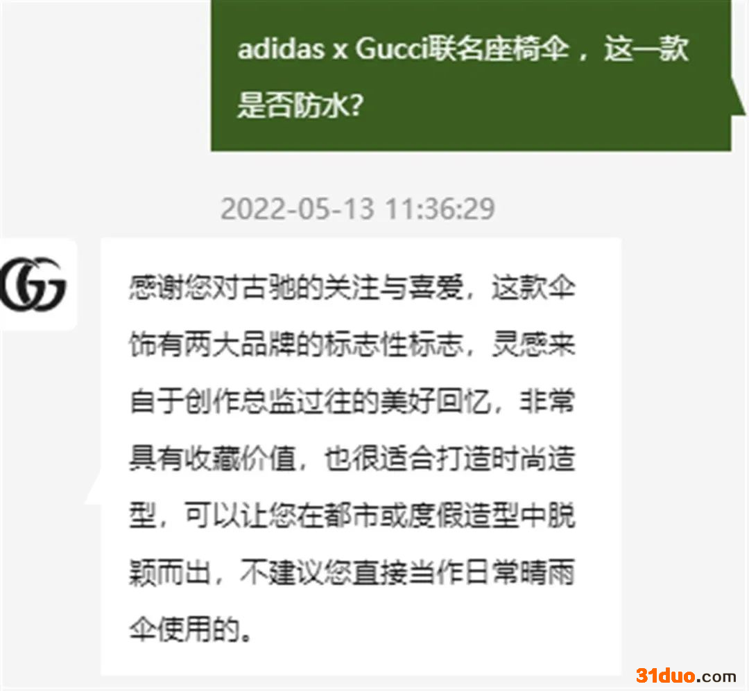 另据极目新闻,同系列中,还有另一把adidas x Gucci联名座椅伞,售价14390元,比不防水的联名系列伞还贵了3290元。这款伞商品细节一栏,并无“不防水”的标注说明。记者再次询问这把伞是否防水,客服也回复称,不建议当做日常晴雨伞使用。
