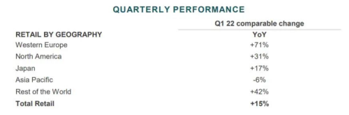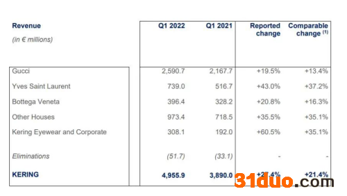 4月21日,开云集团发布2022年第一季度业绩报告,披露收入同比增长27.4%至49.6 亿欧元。直营门店收入同比增长23%;在线销售在本季度继续增长,占直接销售总额的15%。