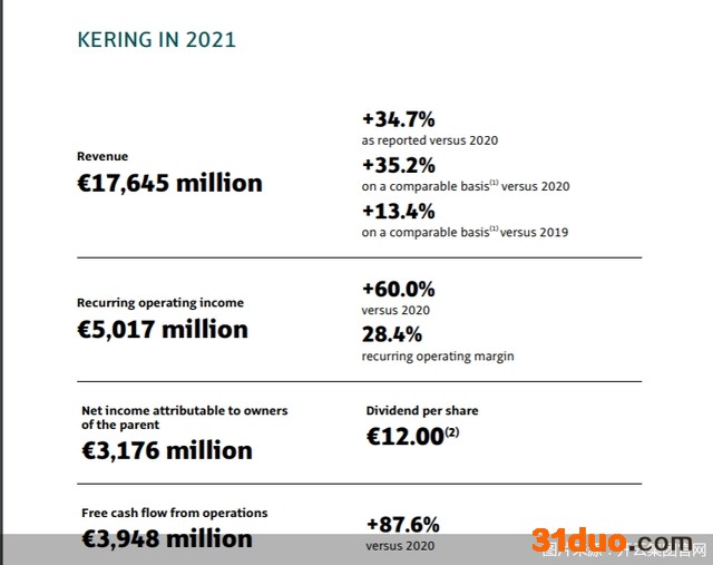 Gucci母公司开云集团2021年财报数据显示,其2021年收入同比大涨35%至176.45亿欧元,与2019年相比可比销售额增长13%,其中,第四季度销售额 54.1亿欧元,同比增长32%。全面恢复疫情前水平,净利润大涨50%至31.76亿欧元。其中,Gucci收入大涨30.8%至97.3亿欧元,超过2019年的96亿欧元,营业利润也大涨42%至37.15亿欧元。