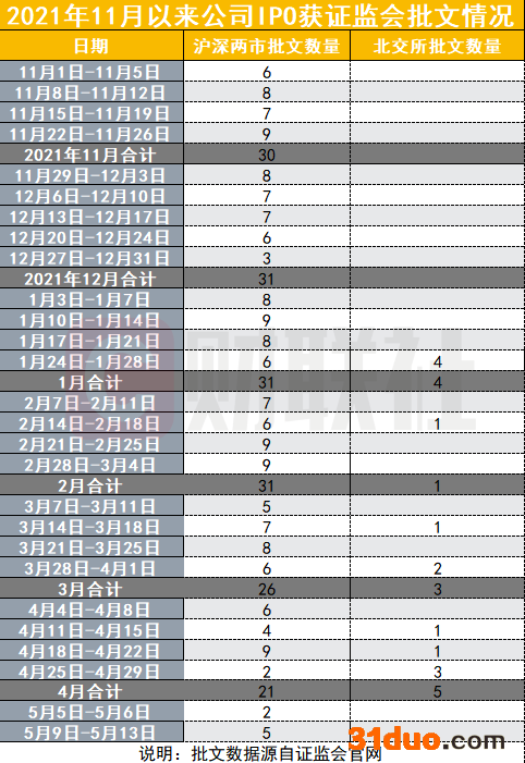 财联社记者梳理后发现,2021年11月份以来(当月北交所成立),证监会已发出至少170份沪深两市IPO首发批文、13份北交所IPO首发批文,以及共终止对14家公司IPO发行注册。