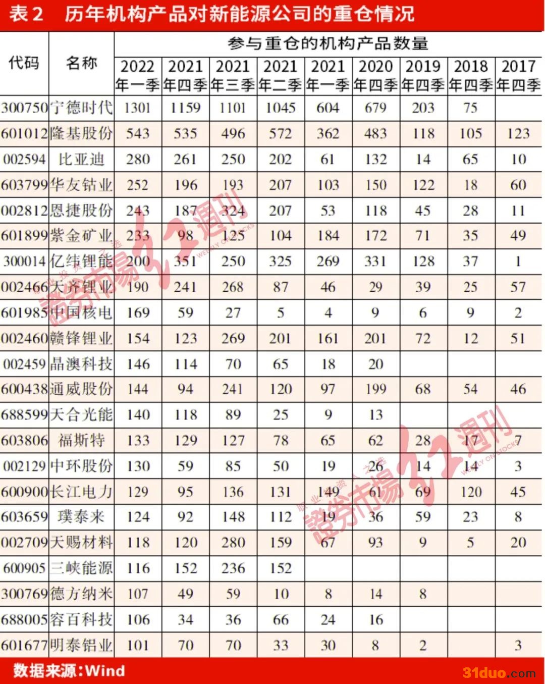 统计近几年机构对新能源领域公司的布局,可以看到,2016年末同时被超过100只机构产品持有的公司中,还没有新能源领域标的的身影。而自2017年开始,被机构重仓的新能源公司则逐年增多,今年一季度末,有23家新能源公司被逾百家机构产品重仓,较2021年四季度末增加了9只,有色金属板块的天齐锂业、华友钴业、紫金矿业、明泰铝业;电力领域的长江电力、中国核电、三峡能源;光伏设备的隆基股份、通威股份;电池板块的亿纬锂能、恩捷股份;整车领域的比亚迪均在其中。