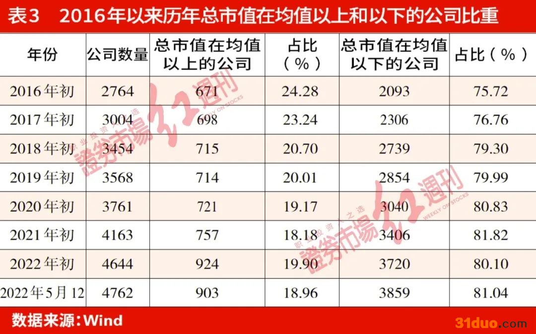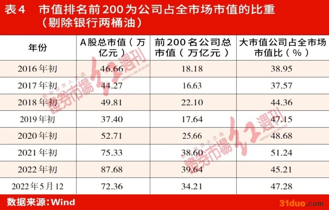 2020年年初以来,市值超过市场整体均值的公司占比已降到了20%以下,最新数据显示,两市4762只非银非“两桶油”公司,只有903家的市值超过了市场均值,占比18.96%,“二八”格局依旧明显。且从市值排名前200位的公司市值之和占全部A股总市值的比重统计,2021年年初的牛市中,比重一度达到了51.24%,也就是说全市场4163家公司,市值排名前200的公司市值和就超过了全市场总市值的半壁江山。之后比重虽有所降低,目前也依然有47.28%(见表3、表4)。