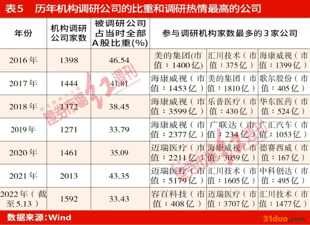 统计2016年以来机构关注调研公司的整体数量,在市场标的总量几乎翻倍的背景下,机构参与调研公司占当时全部A股的比重则呈减少趋势,2016年全年,机构共调研了1398家公司,占当时全部A股比重的46.54%;2021年全年,机构合计调研了2013家公司,占当时全部A股比重的43.35%。今年以来,截至5月12日,共有1592家公司获得机构的调研,占目前全部A股比重的33.43%(见表5)。