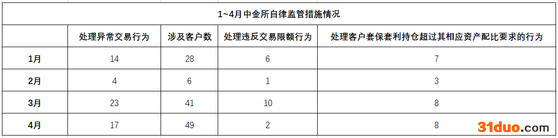 当月,中金所共处理违反交易限额行为2起,对涉及的6名客户采取了限制开仓的措施。处理客户套保套利持仓超过其相应资产配比要求的行为8起,对涉及的8名客户采取了限期调整、要求报告情况、限制开仓等措施。