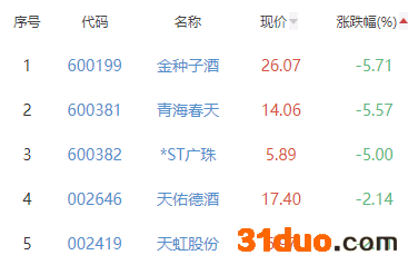金种子酒、青海春天、*ST广珠、天佑德酒、天虹股份位列涨幅榜后五位,涨幅分别为-5.71%、-5.57%、-5.00%、-2.14%、-2.11%。