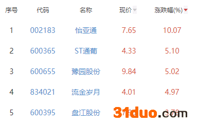 其中,怡亚通、ST通葡、豫园股份、流金岁月、盘江股份位列板块涨幅前五位,涨幅分别为10.07%、5.10%、5.02%、4.97%、3.78%。