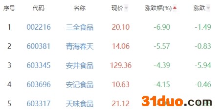 三全食品、青海春天、安井食品、安记食品、天味食品位列涨幅榜后五位,涨幅分别为-6.90%、-5.57%、-4.39%、-4.15%、-4.00%。