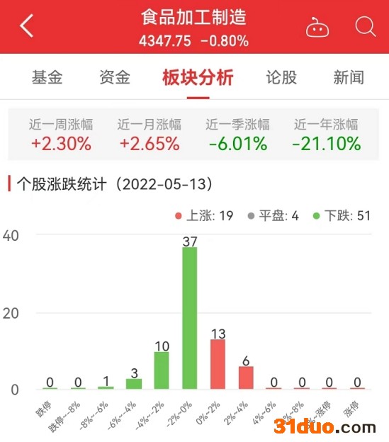 中国经济网北京5月13日讯 今日,食品加工制造板块整体跌幅0.80%,其中,19只股票上涨,4只股票平盘,51只股票下跌。