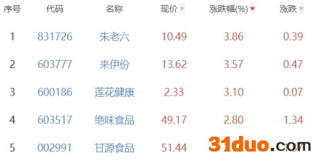 其中,朱老六、来伊份、莲花健康、绝味食品、甘源食品位列板块涨幅前五位,涨幅分别为3.86%、3.57%、3.10%、2.80%、2.74%。