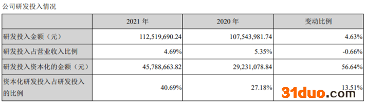 九安医疗2021年研发投入为1.13亿元,占营收比例为4.69%,研发投入资本化的金额为4578.87万元,研发投入资本化比例40.69%。