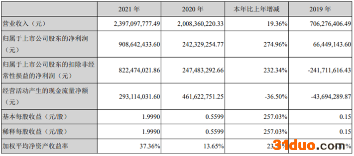 2021年,九安医疗实现营业收入23.97亿元,同比增长19.36%;归属于上市公司股东的净利润9.09亿元,同比增长274.96%;归属于上市公司股东的扣除非经常性损益的净利润8.22亿元,同比增长232.34%;经营活动产生的现金流量净额为2.93亿元,同比下滑36.50%。