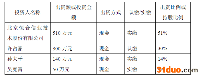 公告显示,芯智感的注册资金预计为1000万元,恒合股份拟出资510万元,占股51%;恒合股份董事、副总经理孙大千拟出资140万元,占股14%;恒合股份技术负责人许占豪和质量经理吴克霄分别拟出资300万元和50万元,占股30%和5%。其中,许占豪的出资额自芯智感注册之日起5年内完成实缴。