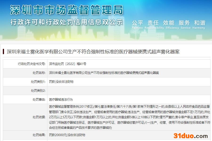 行政处罚决定书显示,深圳来福士雾化医学有限公司生产了不符合强制性标准的医疗器械便携式超声雾化器,对此,深圳市市场监督管理局对该公司罚款20000元,并没收非法财物。