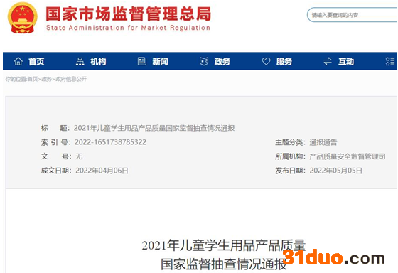 中国经济网北京5月13日讯 国家市场监督管理总局网站日前发布的《2021年儿童学生用品产品质量国家监督抽查情况通报》显示,2021年,市场监管总局组织开展了儿童学生用品产品质量国家监督抽查。本次抽查了2050家企业生产的2186批次儿童学生用品,涉及玩具、童车、童鞋、儿童及婴幼儿服装、学生文具、机动车儿童乘员用约束系统、运动头盔等7种产品。其中2批次玩具和1批次儿童及婴幼儿服装产品涉嫌假冒,已交由企业所在地市场监管部门处理。发现297批次产品不合格,抽查不合格率为13.6%。
