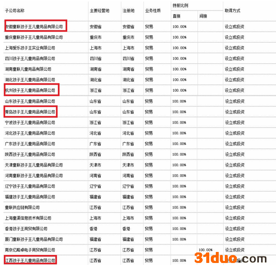 经中国经济网记者查询发现,青岛孩子王儿童用品有限公司、安徽童联孩子王儿童用品有限公司、江西孩子王儿童用品有限公司、杭州孩子王儿童用品有限公司均为孩子王儿童用品股份有限公司(“孩子王”,301078.SZ)全资子公司。孩子王年报显示,孩子王均直接持上述子公司100%比例股份。